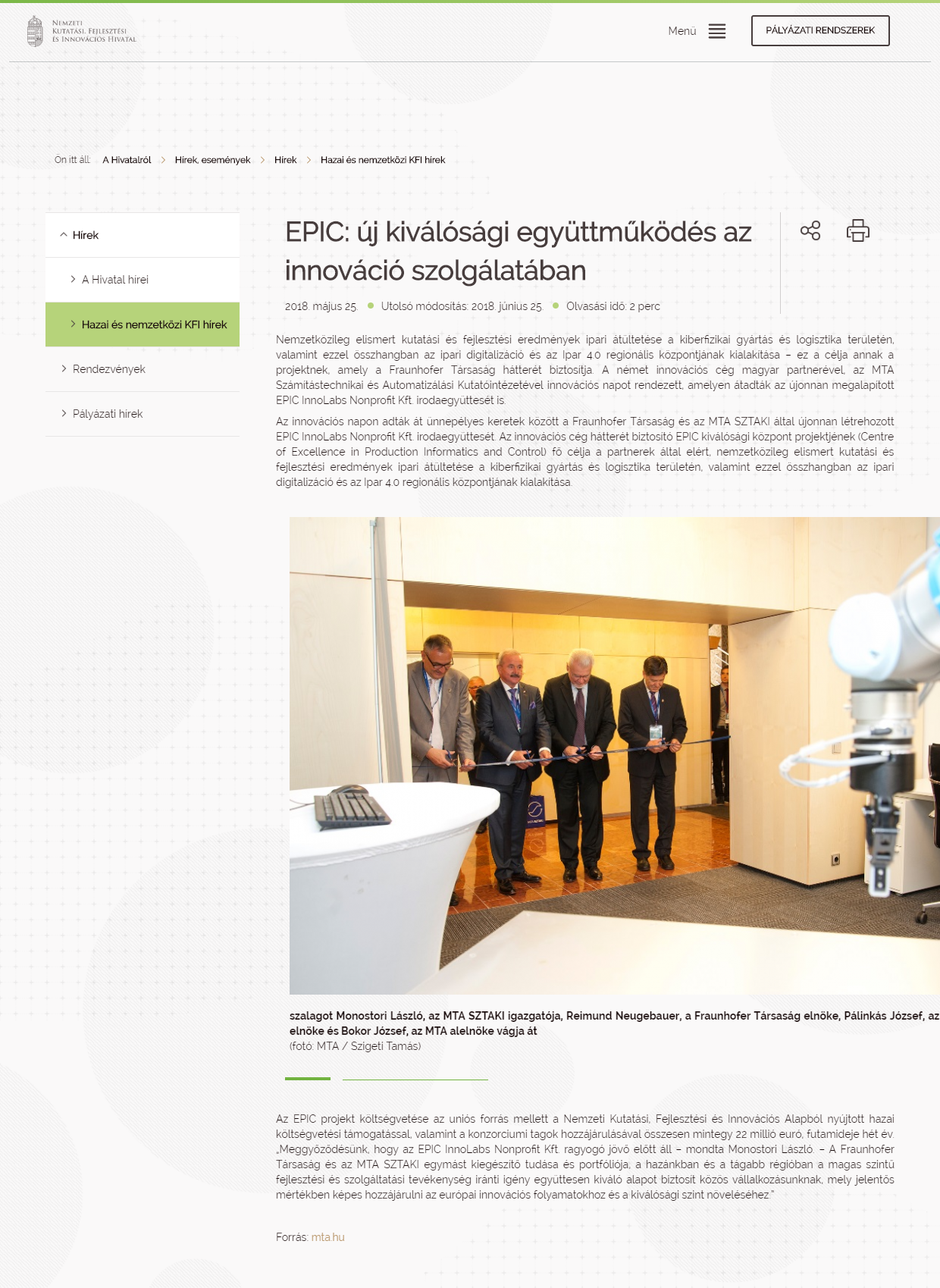 Nemzetközileg elismert kutatási és fejlesztési eredmények ipari átültetése a kiberfizikai gyártás és logisztika területén, valamint ezzel összhangban az ipari digitalizáció és az Ipar 4.0 regionális központjának kialakítása – ez a célja annak a projektnek, amely a Fraunhofer Társaság hátterét biztosítja. A német innovációs cég magyar partnerével, az MTA Számítástechnikai és Automatizálási Kutatóintézetével innovációs napot rendezett, amelyen átadták az újonnan megalapított EPIC InnoLabs Nonprofit Kft. irodaegyüttesét is.